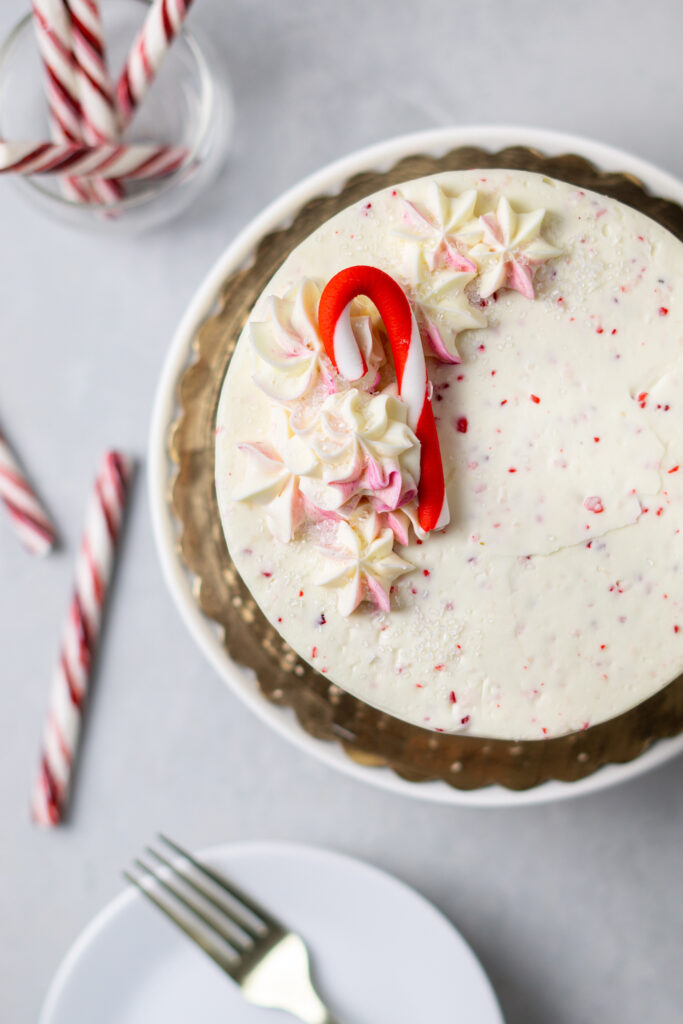 A festive cake to make your holidays a little merrier! Rich chocolate cake, chocolate mint buttercream filling, vanilla buttercream mixed with crushed peppermint candies, and a fondant candy cane on top.